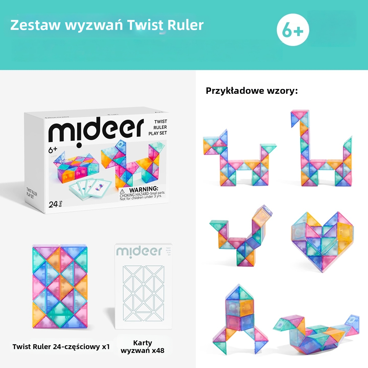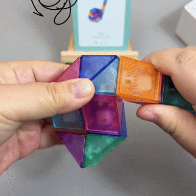 Ta 24-częściowa linijka ma tęczowe, półprzezroczyste kolory — skręcaj, łącz, twórz! Każdy obrót odkrywa nową formę: proste sześciany zamieniają się w statki kosmiczne, łabędzie, serca lub żyrafy. Gładkie, zaokrąglone krawędzie i elastyczne połączenia zapewniają bezpieczne odkrywanie nieograniczonych możliwości geometrii przez małe rączki.